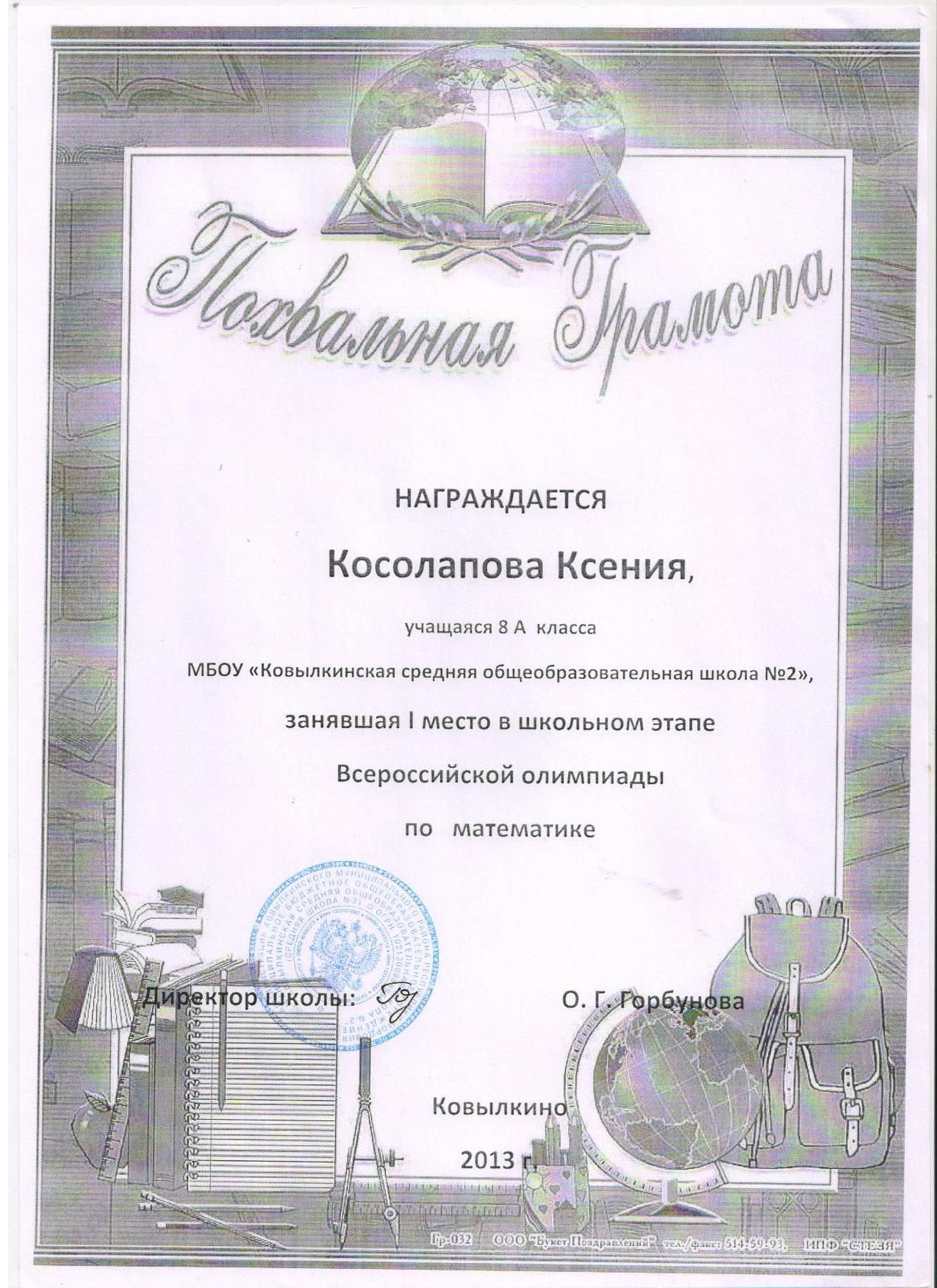 Награждается Косолапова Ксения, учащаяся 8 А класса МБОУ «Ковылкинская средняя общеобразовательная школа №2», занявшая I место в школьном этапе Всероссийской олимпиады по математике. Ковылкино, 2013г.